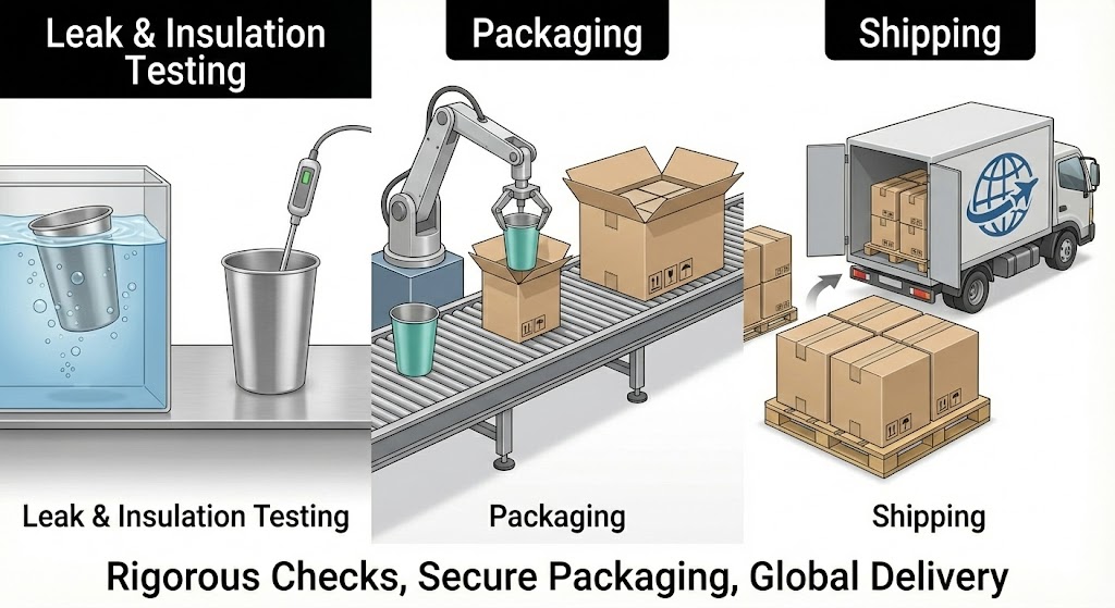 Every cup is inspected with strict leak-proof and insulation performance tests to ensure consistent quality. After passing all checks, each unit is carefully packaged in individual boxes or curated gift sets, then shipped safely and directly from our factory.